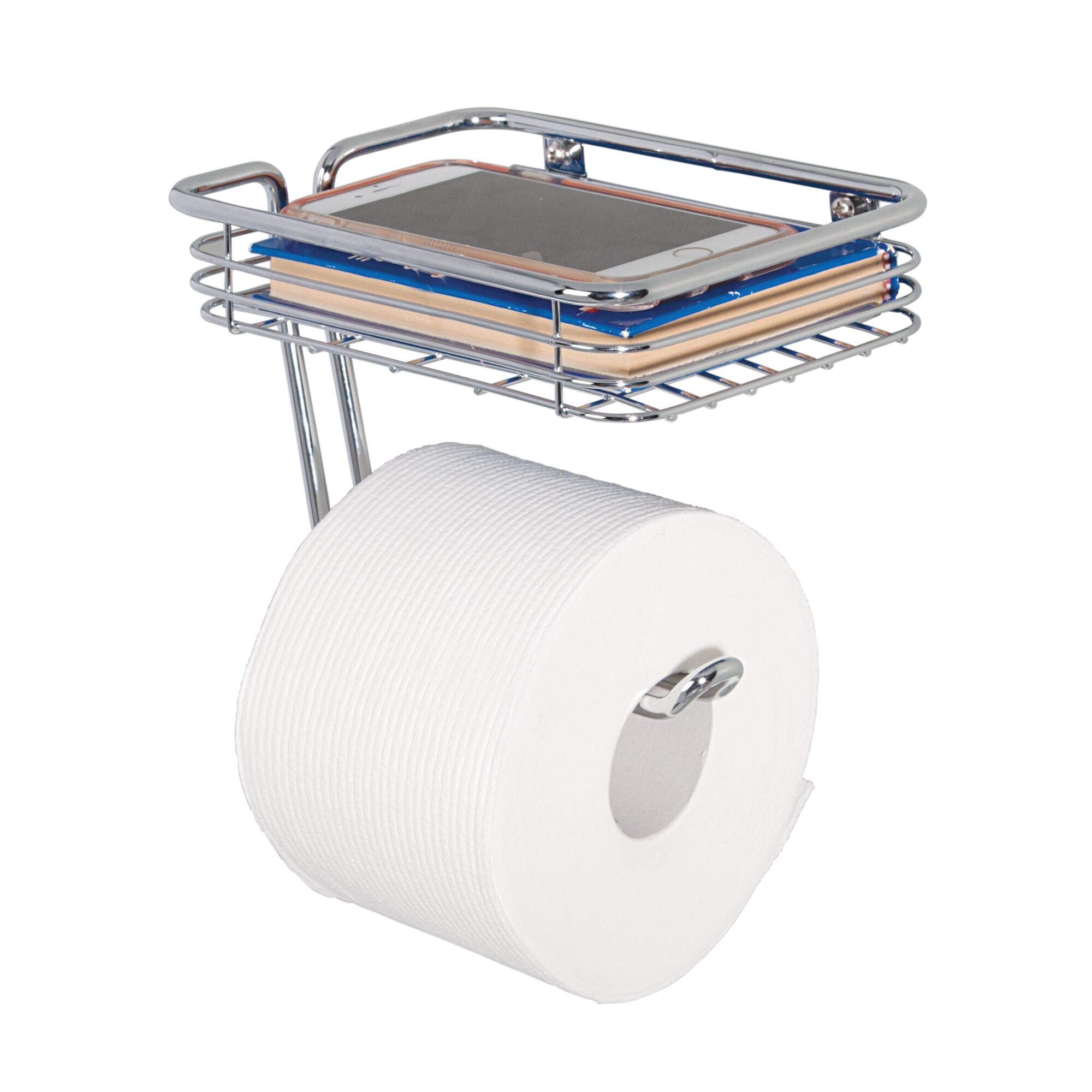 - FUNCTIONAL TOILET PAPER HOLDER: Wall mount toilet tissue holder dispenses one roll on the rack and can hold phone, wet wipes, tissues, or smaller items on shelf. Perfect for keeping the toilet paper within arm's reach. Ideal for master bathroom, guest bathroom, or kid's bathroom