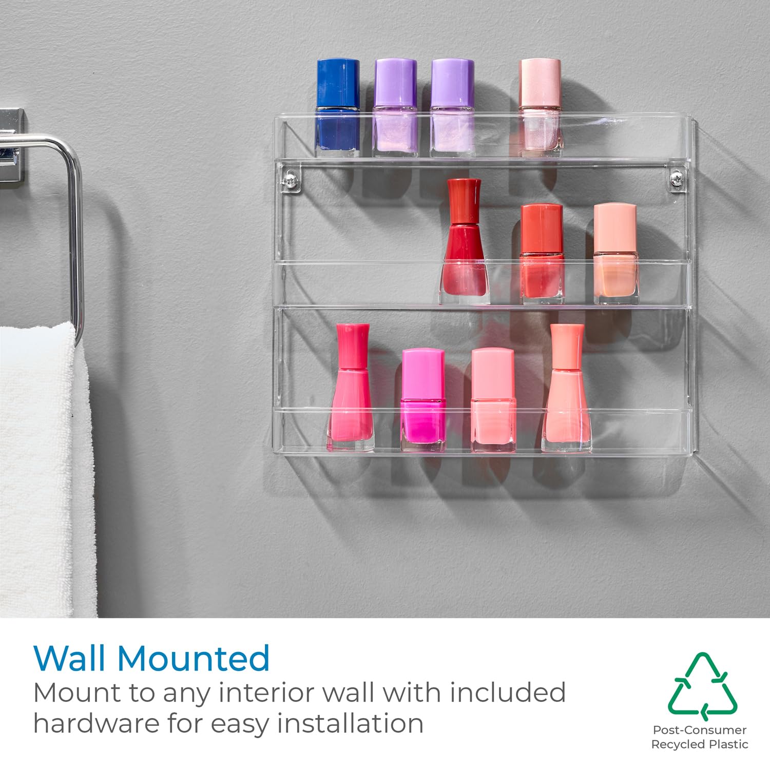 - WALL MOUNT COSMETIC ORGANIZER: The iDesign Hanging Nail Polish Rack is designed with three shelves to store and display a variety of bathroom necessities such as nail polish, makeup, cosmetics, jewelry, accessories, and more.