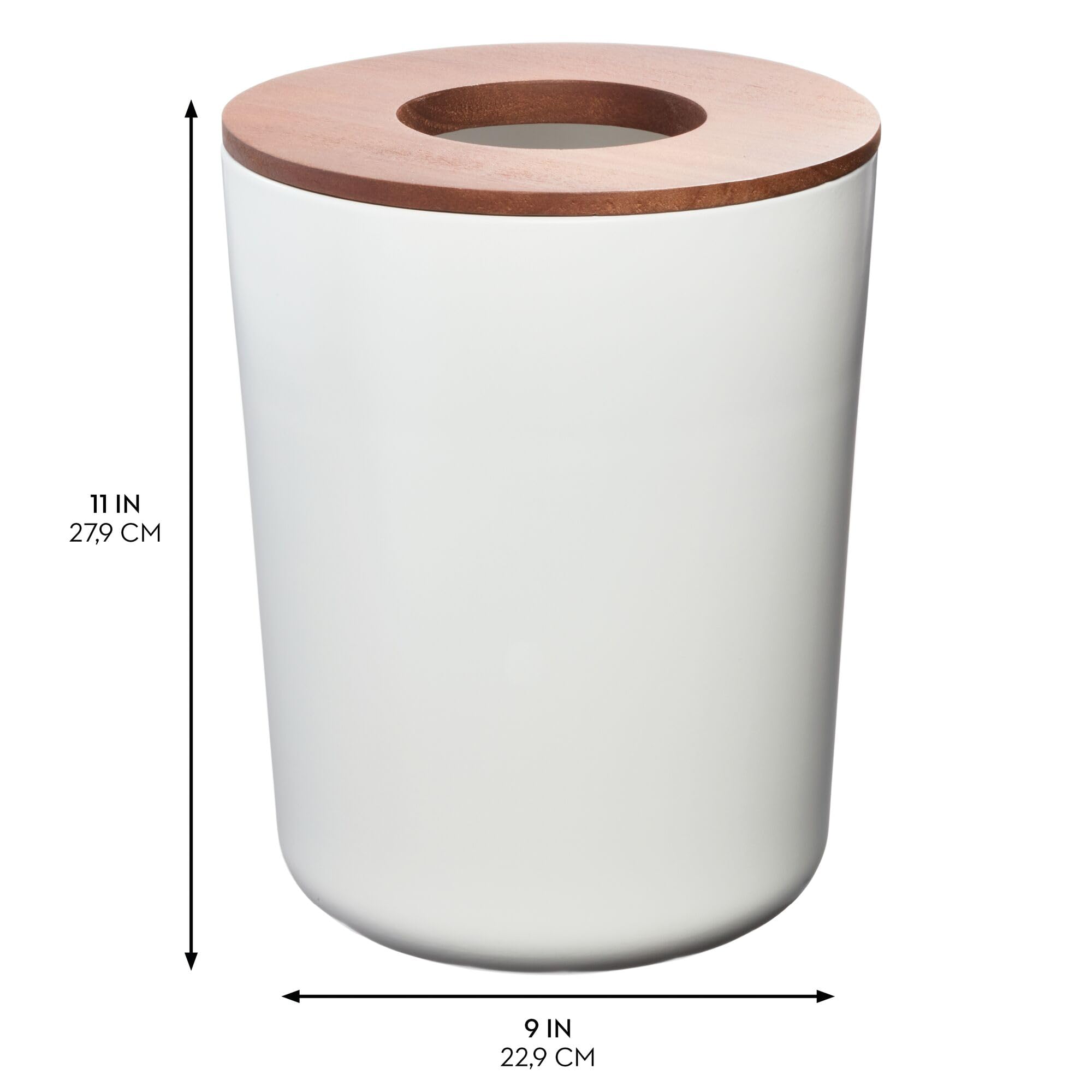 • COMPACT DESIGN - The iDesign Eco Vanity Trash Can displays a clean, minimal look that pairs harmoniously with any decor; The removable paulownia wood lid keeps trash neatly contained while the top cutout makes for easy trash disposal; For convenience, its slim dimensions nestles neatly into tight corners or fits inside cabinets or under desks for discreet storage; Set of 2