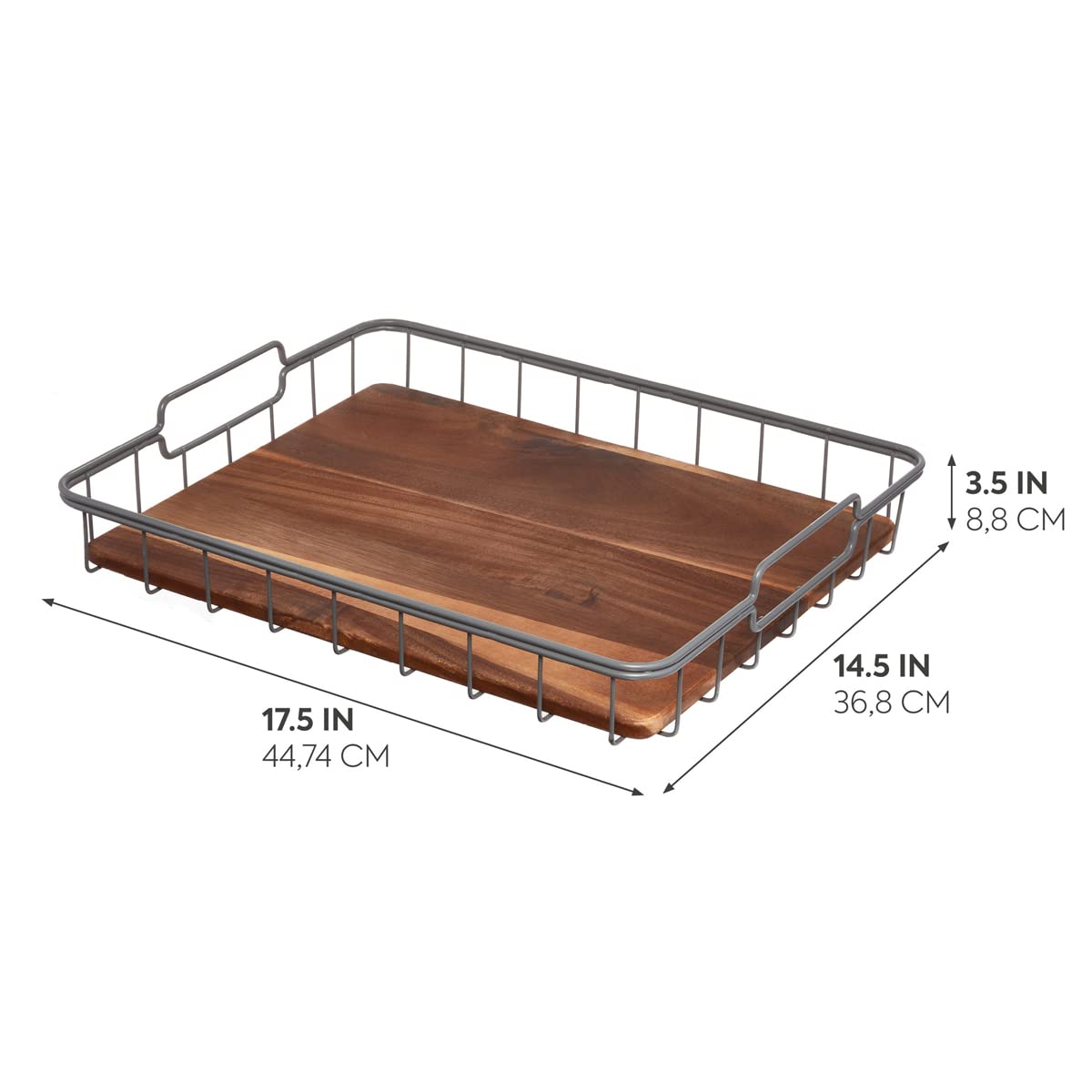 - BUILT TO LAST: Built of a durable and water-based finished Acacia wood and wire walls, this tray can be cleaned quickly and without the threat of water damage. Measures at 14.5" x 7.5" x 3.2" to make the most of your kitchen space
